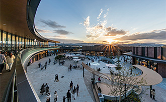 富士山を望む傾斜地に、3層のストリートに80店舗以上が並ぶ新エリア「ヒルサイド」を新設。約180mの橋も設置しました。